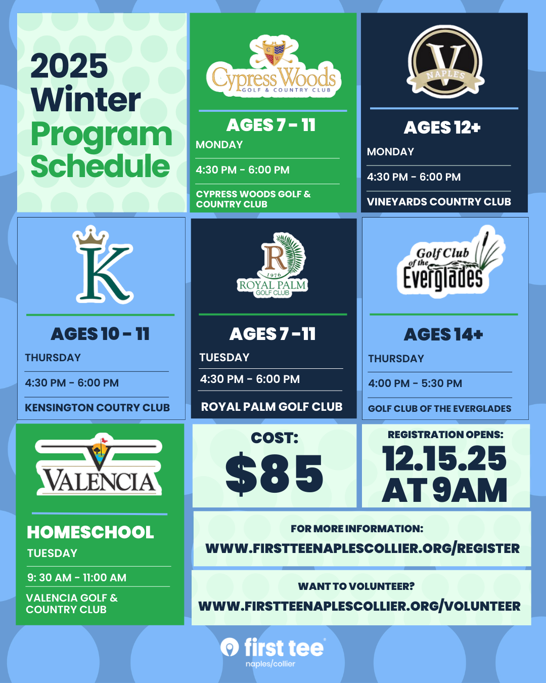 Winter 2026 Program Schedule! General Information Registration is opening on MONDAY, DECEMBER 15TH AT 9AM Cost: $85 Register Now! Stay Involved with the First Tee App First Tee App Information New Registration Information Learn about the improvements to our Registration Portal Registration Portal Update Register Now